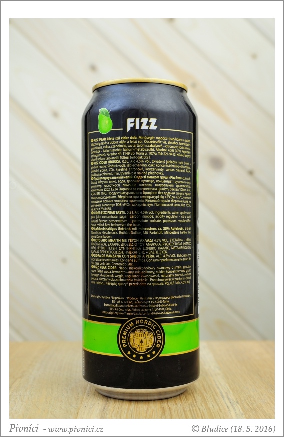 Složení: jablečné víno, cukr, koncentrát hruškového džusu, přírodní aroma, oxid uhličitý, kyselina citrónová, sorban draselný (E202), disiřičitan draselný (E224)