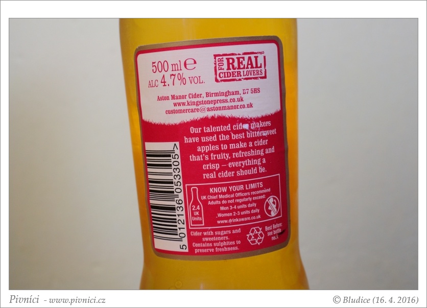 Jednoduchý, přímočarý, osvěžující cider. Celkem dobře se pije.Minimální trvanlivost: 31. května 2016