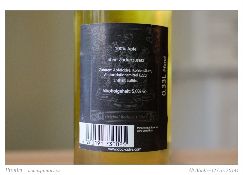 Jednoduchý, ničím zajímavý, ale celkem dobře pitelný cider.Cena 1,19 € za 0,33 l v REWE v Berlíně