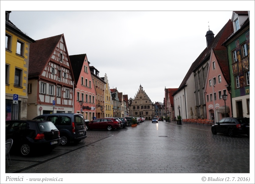 Z vlaku vystupujeme v Ellingenu, městečku s pěkným zámkem a především také zámeckým pivovarem Fürstliches Brauhaus Ellingen s pivovarskou restaurací. Na prostranství před pivovarem se zrovna chystá festival, který ale bohužel startuje až ve čtyři hodiny. To už tu nebudeme. Pivovarská hospoda zeje prázdnotou a vypadá zavřeně. Dveře naštěstí zamčené nejsou a tak se drze vetřeme dovnitř a u personálu, který se věnuje přípravě festivalu, si vyškemráme dvě piva. Kellerbär i Dunkel jsou obě velmi chutná a pitelná piva. Další piva z tohoto pivovaru si kupuje v lahvové formě v pivovarské prodejně a ve chvíli, kdy se s úderem dvanácté hospoda zaplní k prasknutí strávníky, vyrážíme v dešti na vlak. Zvláštní, meteorologové nám slibovali slunečné počasí.