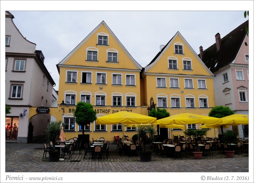 Kousek vedle (také v centru) města se nachází i hospoda Brauereigasthof zur Münz s vlastními pivy vařenými na zakázku v pivovaru Postbräu Tannhausen. Když už jsme tady, zkusíme samozřejmě ochutnat. Dáváme si místní Münz Edel Export a Kaltenberg Kellerbier. Kaltenberg je dobře pitelné pivo, což se o „místním“ Edel Exportu rozhodně říct nedá. Nic moc pitelné pivo s podivnými tóny kukuřice.