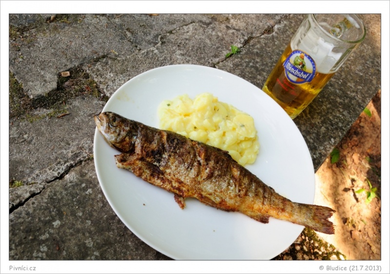 Fischerfest je vlastně taková velká žranice různých druhů ryb, ať už smažených, uzených, či grilovaných. Uprostřed zámeckého parku stojí velký stan s řadami stolů, u kterých sedí davy Bavorů, kteří tentokrát nekonzumují pečená kolena, ale nacpávají se pořádnými porcemi ryb a to vše zalévají pivem, protože „ryba přece musí plavat“. My si z nabídky vybíráme grilovaného pstruha a jelikož nejsme Bavoři, usoudíme, že nám bude vzhledem k velikosti porcí stačit jeden dohromady. Ještěže tak. Najíme se tak akorát. Pstruh je vynikající, čerstvý, k tomu výborný bramborový salát a samozřejmě také pivo. Velmi dobře pitelný Kulmbacher Mönchshof Original Pils. Této zastávky na cestě rozhodně nelitujeme.