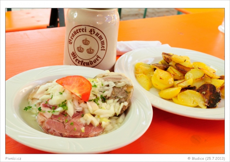 K jídlu si vybíráme z denního meníčka Gemische Sülz a Bratkartofel. Sülz je směs tří druhů výborných tlačenek v hlubokém talíři s chutnou octovou zálivkou a spoustou cibule. K tomu jako příloha na dalším talíři pečené brambory. Naštěstí jsme si prozřetelně opět dali pouze jedno jídlo dohromady, je toho obří hromada, po které bychom se asi už ani nehnuli. Jídlo je výborné a teplé brambory se studenou a osvěžující tlačenkou chutnají překvapivě skvěle.