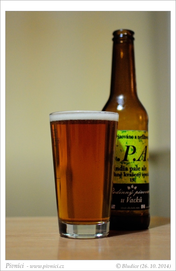 S novou IPA přišli v pivovaru U Vacků z Chlumce nad Cidlinou, dokonce ji i nalahvovali do skla. Je to sympatické, i když je třeba zmínit, že po vzoru třeba Kocoura lahvují i pro „obyčejné pivaře“ do petek. IPA je patnáctka, plná karamelu a karamelek, je zároveň hodně ovocná, s citrusy, lesním i tropickým ovocem. Karamelek je v pivu trošku moc, přechází až do nepatrných tónů máslíčka, ale jinak je to celkem příjemné a slušně pitelné pivo.