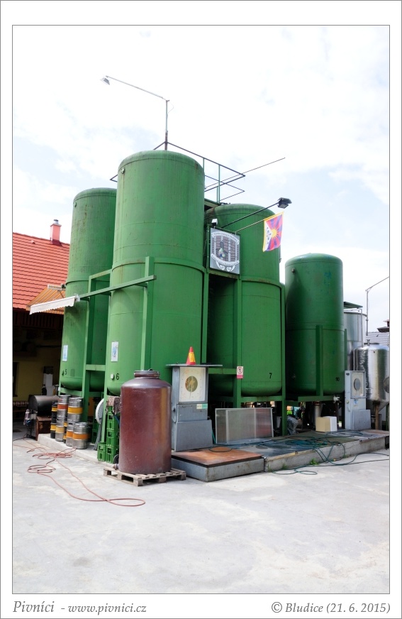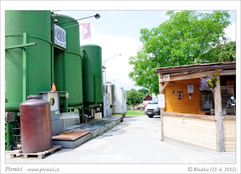 Před pivovarem stojí velké zeleně natřené tanky, zřejmě užívané k výrobě zdejších destilátů, vedle nich se krčí stánek s výčepem. Posezení na zahrádce je fajn, dokonce i zakryté stříškou z plachty, kterou při právě přicházející lehčí spršce využijeme. Na čepu je bohužel jen jedno pivo – světlý ležák. Zbytek piv už návštěvníci vypili a je logické, že v neděli se nic nového narážet nebude.