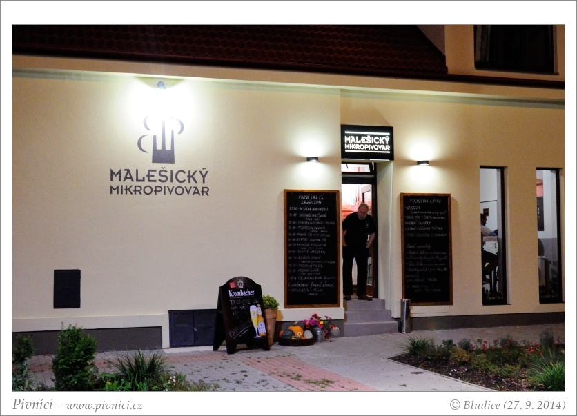 Posledním cílem naší cesty byl Malešický mikropivovar, který měl právě na Den českého piva naplánováno slavnostní otevření. Nejedná se ale o pivovar v pravém slova smyslu, ale spíše o vícepípovou hospodu. Od desíti hodin až do večerních osmi se zde postupně narážela piva z různých menších pivovarů, vždy v tolik hodin, jakou měla piva stupňovitost. My dorazili až v devět večer, takže vše již bylo na místních desíti pípách na čepu. Malešický pivovar je pěkná nekuřácká hospoda, se světlými stěnami, hezkým výčepem, židlemi a stolky ze světlého dřeva. A za výčepem se nachází maličká čtyřicetilitrová varnička, kde by se měly v budoucnu vařit místní limitované várky piva (ani nevíme, jestli se vůbec dostanou na veřejnost).