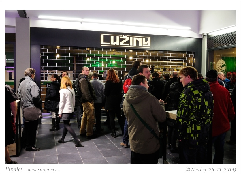 V den prvního čepování byla v Lužinách všechna piva zdarma. Docela jsme se báli, že to zde bude ještě mnohem horší, než na Kolčavce, ale nakonec jsme sebrali všechnu odvahu a zašli to zkusit. Před pátou zde už stál slušný zástup lidí, ve vstupu do podniku ale bránila mříž (nicméně pár zřejmě VIP hostů v té době už uvnitř popíjelo). S úderem páté mříž zajela a proud lidí zamířil dovnitř, ke stolkům a výčepu. Pivo bylo sice zdarma, ale platila se stokorunová záloha na sklo. Obsluha občas kolem stolů chodila – ale často bylo rychlejší si vystát zhruba desetiminutovou frontu u výčepu. Se zálohou u obsluhy byl trochu chaos – někdy vyměňovala půllitry kus za kus, jindy je rozdávala ledabyle, neřešila to a jindy zase prázdné zálohované půllitry ze stolů odnášela (holt asi zvyk je zvyk). Ale jinak to zde probíhalo relativně poklidně.