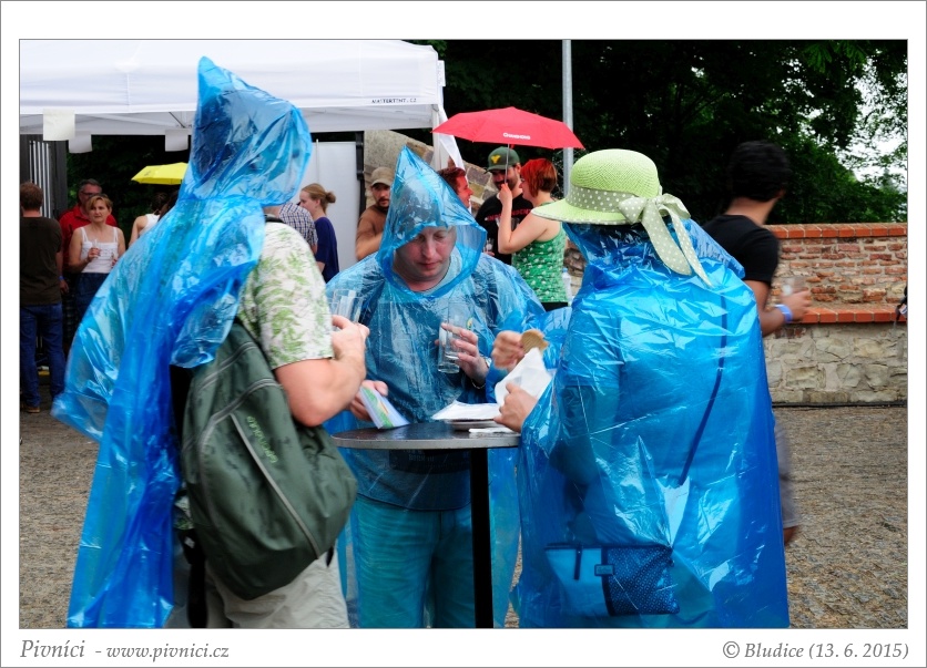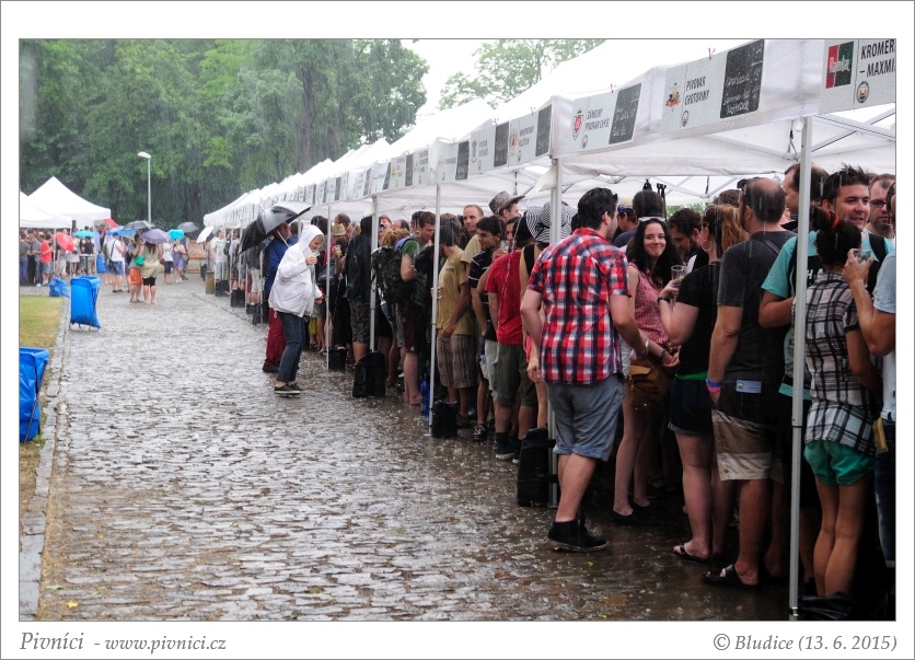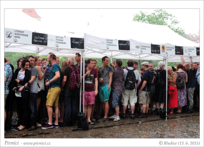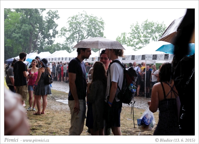 Co se týče počasí, to letos pořadatelům příliš nepřálo. Páteční extrémní vedro vystřídalo v sobotu vedro sice trochu menší, ale doplněné drobnými přeháňkami a okolo páté také pořádnou přes půl hodinu trvající průtrží, při které se ukázalo, že jediná místa, kam se lze před provazy vody z nebe schovat, je jeden samostatný stánek pro návštěvníky u vchodu, stánek kryjící malé pódium a pak již pouze stánky zastřešující výčepy pivovarů. Před výčepy se tak vytvořil prakticky neproniknutelný dav více či méně opilých lidí, přes které se dalo dostat se skleničkou k pípě dosti obtížně. Každý návštěvník, který takto v davu uvízl, pil piva, u kterých se mu podařilo zakotvit a festival se tak proměnil z festivalu degustačního na festival chlastací. My jsme raději zůstali venku pod deštníkem a půl hodinky jsme zdatně střízlivěli. Určitě by nebylo na škodu, kdyby organizátoři pro příští ročník vyhradili více stánků pro návštěvníky, aby bylo možné se před deštěm schovat, aniž by měl člověk pocit, že nastoupil do posledního autobusu jedoucího ze Slunce ve skle do centra Plzně.