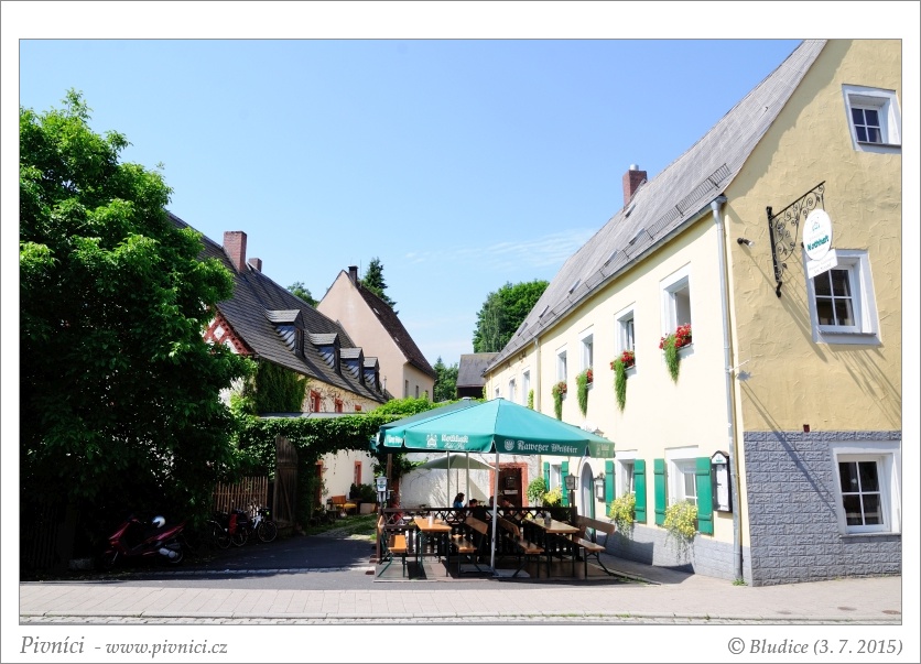 O pár metrů dál na břehu říčky se nachází restaurační pivovar Kulmbacher Kommunbräu. Mají zde malou zahrádku pod mladými kaštany. Líbí se nám zda. Dáváme si malý Hell a Bernstein, poté i malý Festbier. Všechna piva jsou trochu sladší a sladovější, ale celkem dobře pitelná. A konečně si zde dáváme něco k snědku. Schäuferlu, na kterou máme chuť už od Chodovaru. Cena je sice ve srovnání s Roppelt's Kellerem vyšší, ale jídlo je to moc dobré a syté. Z jedné bavorské porce se jako vždy najíme oba.