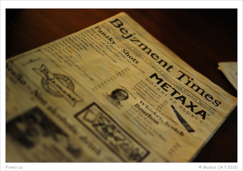 Uklidňuje mě však nabídka nápojového lístku. Téda. Na čepu mají Únětice a Kocoura! Žádný zvětralý gambáč a kyselá plzeň, ale poctivá piva z malého pivovaru. To vypadá nadějně. Já si dávám Kocoura za 45Kč (mají zrovna Haka lager a ten já ráda), Honza s Bárou přechází na vodu (číšnice jim přinese do půllitru natočenou vodu, kterou při placení neúčtuje) a ostatní volí Únětickou dvanáctku za 35Kč. Vysvětluji Pasimu a Nině, že se jedná o poctivý Bohemian Pilsner.