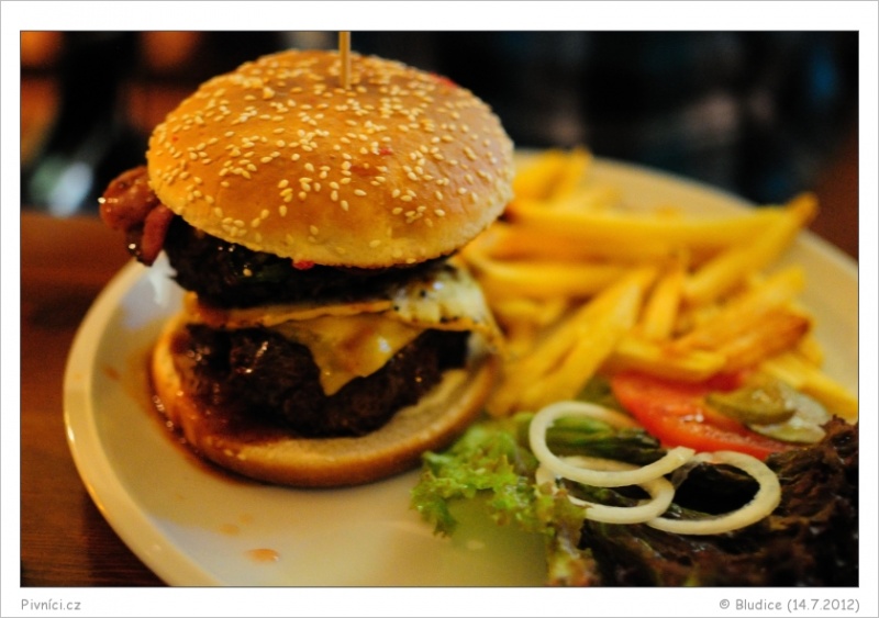 Nina nakonec volí sendvič (pěkná hromada jídla, to se musí nechat), Bára jakýsi speciální hamburger, Pasi "The Royal burgr ty vole!„ (No, ty vole, tohle někdo dokáže všechno sníst?) a my si dáváme "D Big čýz" (když už je v té akci 3 za cenu dvou). Musím říct, že burger je výborný. Sice ne v tak výborné domácí housce jako jej dělají v Blackdog Cantině, ale poctivý. Houska je do křupava opečená a maso libové a tak akorát medium. Zelenina je přidaná na talíř jako příloha, nikoliv přímo do burgeru. Mně osobně to vůbec nevadí, alespoň se lépe jí (a kdo chce zeleninu v burgeru, může si ji tam přece sám přidat, že jo?). K burgerům ještě dostáváme klasické obyčejné hranolky (neurazí) a sladký kečup. K výbornému jídlu navíc poctivé Únětice a Kocour. Nu, myslím, že sem se ještě někdy v budoucnu určitě podíváme. Na Únětice, burgera a podrbat za uchem místního psího hlídače Oskara (pokud nesnášíte psy v hospodě, pak Bejzment není nic pro vás).