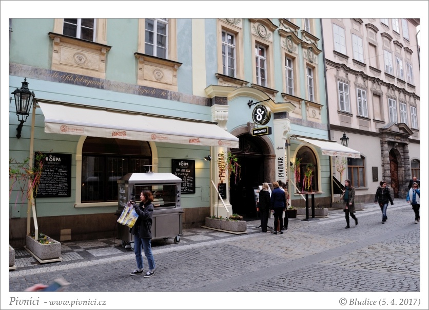 Pivo v pivovaru U Supa vaří slavný sládek Ivan Chramosil, dlouholetý sládek dalšího turistického pivovaru – U Fleků. Jak jsme už zmínili, momentálně je na čepu světlé a tmavé pivo, cenově vychází na pěkných 59 a 69 korun za půllitr. Co nás ale překvapilo, byl způsob čepování světlého piva – z jedné pípy načepovali pěnu a z druhé ho dočepovali. A nebo naopak – z druhé pivo načepovali a z první ho „dopěnili“, občas ho ještě dolili z dalších půllitrů. Dělali to tak úplně u každého půllitru a dle lehce odlišné barvy pěny se zdálo, že jde o dvě různá piva. Moc jsme netušili, co to má znamenat – obsluhy jsme neměli odvahu se na tuto alchymii ptát. Ale pak jsme zaslechli něco o tom, že světlé méně pění, takže si musí pomoct tmavším (zřejmě šlo o něco jako polotmavé). Těžko říci, jestli šlo o předmíchané domácí řezané pivo či nějaké jiné průmyslové. Každopádně jde o docela zvláštní praktiku.