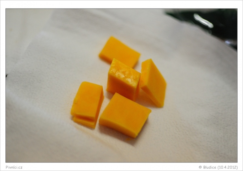 Dvojici českého sýra s anglickým pivem vystřídal anglický sýr s českým pivem (alespoň podle země výroby, nikoliv podle pivního stylu). Sýr Cheddar jsme zapíjeli American Pale Ale Easy Rider z létajícího pivovaru Nomád. Jedná se o novější várku tohoto piva, ve které byly použity jiné chmely, než-li ve várce první. Osobně mi tato verze chutná mnohem lépe. V kombinaci s Cheddarem ovšem Easy Rider jednoznačně hraje prim a Cheddar je upozaděn výraznými chmelovými tóny. A jak pravil Weetek, či Honza Kočka, asi by bylo vhodnější pro párování s Cheddarem zvolit nějaký English Pale Ale, u kterých bývají chmelové tóny méně agresivní.
