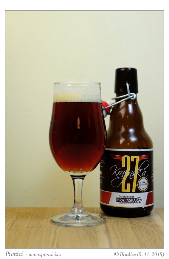 Bludice před půl rokem ze služebky v Budějovicích přivezla suvenýr od zdejšího minipivovaru Krajinská 27. Pivo Krajinská 27 Speciál o obsahu alkoholu 10,5 % jsme nechali chvilku uzrát, ale dvouletou trvanlivost jsme se rozhodli nepokoušet, s dlouhodobou archivací českých piv příliš dobré zkušenosti nemáme. Pivo je to hutné, toustové a karamelové, sladké a zároveň lehce nakyslé. Je nepříliš hořké, s lehkými tóny sušeného i kandovaného ovoce. Trochu rozhádané, možná pomalu nakročené ke zkáze (za rok a půl by to asi byl pořádný kyseláč – jak se nám to stalo nedávno s Břevnovským Imperial Stoutem), ale jinak vcelku fajn pivo.