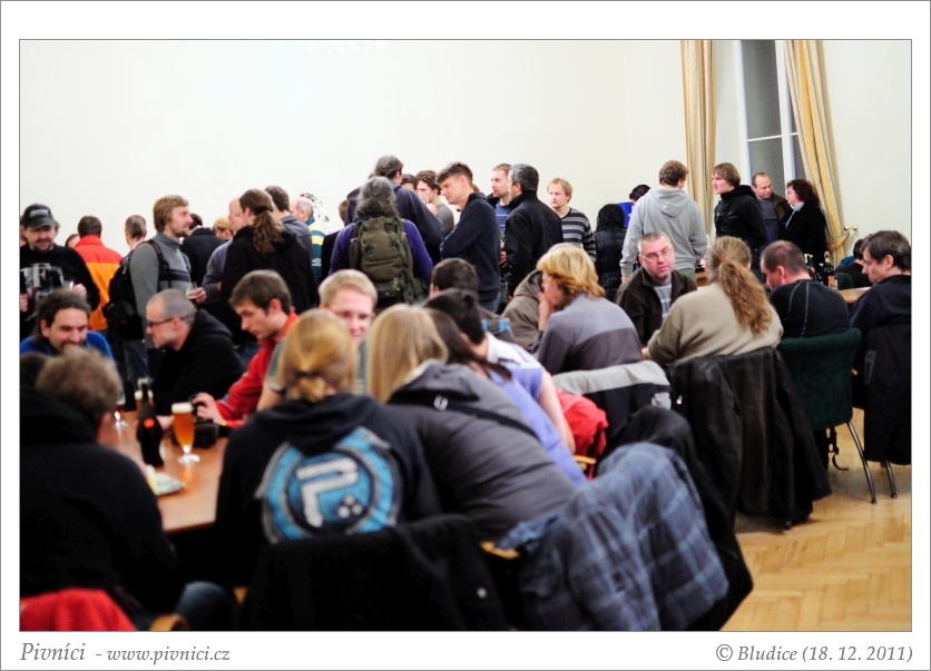 Z Líšně zamíříme do pivovaru Starobrno. Ne, že bychom chtěli ochutnat další výpotky heinekeního kolosu, ale v areálu pivovaru se koná poslední Vánoční pivní besídka Pivní rozmanitosti. Přijíždíme asi s hodinovým zpožděním a jsme překvapeni obrovským zájmem lidí o tuto akci. Zatímco v Praze byly prostory klubu Hoo Doo téměř prázdné, tady je hlava na hlavě. Všechny židle jsou již dávno rozebrané (nemluvě o těch několika málo stolech). Prostředí je příjemné, dobře osvětlené a naprosto nekuřácké. Hurá :)