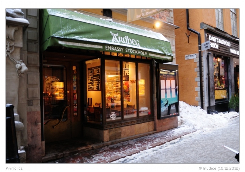 Ardbeg Embassy je bar a restaurace nacházející se v historickém centru Stockholmu. Co se týče prostředí, to zde není nic moc. Ne, že by bylo nějak nepříjemné, ale je takové studené, trochu připomíná naše české Potrefené husy a podobné podniky. Jak sám název podniku napovídá, tak kromě slušného výběru piv, zde můžete ochutnat také některou z obrovského množství Whisky. Whisky je vůbec ve Stockholmu velmi oblíbená, rozsáhlý sortiment whisky nabízejí všechny lepší pivní bary. Pokud jste milovníky nakuřovaných piv, rozhodně zde musíte ochutnat pivo Strömsholms Ardbeg Embassy No:1, které je vařeno speciálně pro tento podnik. Lidé, kteří toto pivo ochutnají, se v podstatě dělí do dvou skupin: na ty, kterým přijde naprosto odporné a nepitelné a pak ty, kteří si ho zamilují. Já jsem se zařadila do druhé skupiny. Při výrobě piva byl použit slad nakuřovaný rašelinou, který se používá při výrobě Ardbeg whisky. Drsné kouřové rašelinové tóny se u tohoto piva ještě znásobují tóny praženými a vše je ukončeno velmi dlouhým kouřově fenolovým dozníváním. Skvělé pivo a důvod, proč při návštěvě Stockholmu navštívit Ardbeg Embassy. Pokud však nejste milovníky nakuřovaných piv, můžete si zde vybrat z poměrně slušné nabídky dalších piv na čepu. Marley zvolil výborné švédské pivo ve stylu Scotch Ale Eskilstuna Höst 2012 a rozhodně nelitoval.