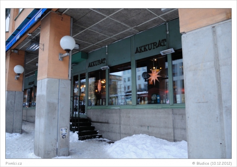 V Akkuratu jsme vlastně byli v pondělí ještě jednou před naší večerní návštěvou. Zašli jsme si sem na polední meníčko. To zde nabízejí za cenu 95,- švédských korun. Pro našince tedy dosti vysoká cena, ale pokud si chce člověk ve Stockholmu dát jednou za čas také nějaké to teplé jídlo, musí si prostě připlatit. Na druhou stranu cena menu je téměř stejná jako cena mnohých piv. Nutno říci, že oběd byl velmi dobrý a velmi vydatný. Polévka k dispozici v neomezeném množství, salátový bar, hlavní jídlo a na závěr velmi dobrá překapávaná káva. Specifikum je také velké množství různých ovocných šťáv. Rozhodně není zvykem dávat si zde k obědu pivo. Zatímco večer Akkurat funguje jako životem bzučící pivní bar, přes poledne se z něho stává velmi žádaná meníčková restaurace.
