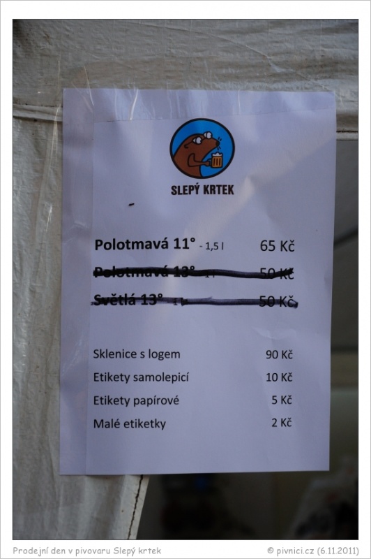 Do pivovaru jsme dorazili okolo druhé hodiny pěkně postaru pěšmo a našli jsme jej poměrně snadno podle několika zaparkovaných aut. Bohužel jsme poněkud podcenili zájem lidí o pivovar a v době, kdy jsme dorazili, byla k dostání již pouze dvě z původních tří piv. Než jsme si vystáli frontu, zmizelo i pivo předposlední a zůstala v nabídce pouze polotmavá jedenáctka. V prodeji bylo pivo lahvované, točené bylo pouze v třetinkových kelímcích na ochutnání zadarmo a se striktním zákazem snažit se za něj zaplatit. Při čekání na natočení objednaných lahví (krtek je prostě svéráz a při točení pěkně pění) zpravidla dostali návštěvníci takovýchto ochutnávek hned několik. O naši pohodu se zde starali sympatičtí majitelé pivovárku osobně.
