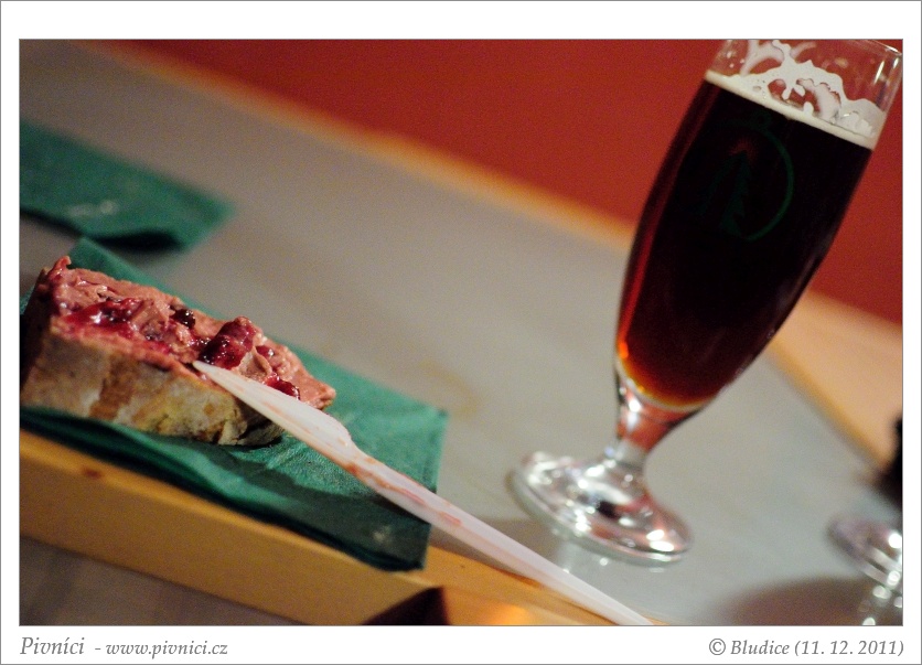 Ale dost bylo naříkání a rychle přejdu k pozitivům. Výběr piv byl skutečně famózní. Z bohatého seznamu piv, které Pivní rozmanitost na besídky připravila, jsme měli možnost v Praze ochutnat 7 úžasných zahraničních piv a dva české vánoční speciály. Kromě námi ochutnaných piv byl na čepu také oblíbený Kocour Saurus a Opat Sváteční speciál. Připraveny byly také dobroty na zakousnutí k pivu, především skvělé paštiky a výborný čerstvě upečený chleba.