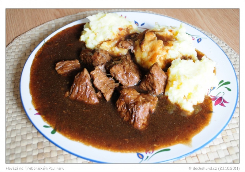 A co se stalo s čokoládovou pšenicí? Nechali jsme se inspirovat Kulovým bleskem a jejich u nás oblíbeným hovězím na všemožných pivech a ukuchtili si doma k nedělnímu obědu vlastní hovězí na čokoládovém pšeničném Paulinerovi. Recept na podobný pokrm můžete najít například na stránkách páně Cuketky. A byla to dobrota (ač na fotografii to tak nevypadá… halt budeme ještě muset trochu doladit estetickou stránku našeho stravování :)). Pokud by chtěl někdo ozkoušet pšenično-čokoládové hovězí, tak hlásím, že Paulinera by dle všeho mohli v nejbližších dnech točit v Kulovém blesku.