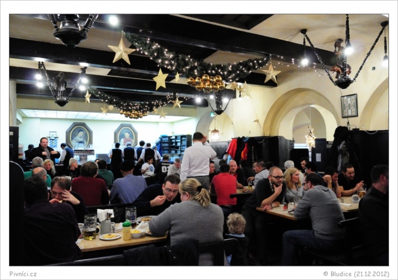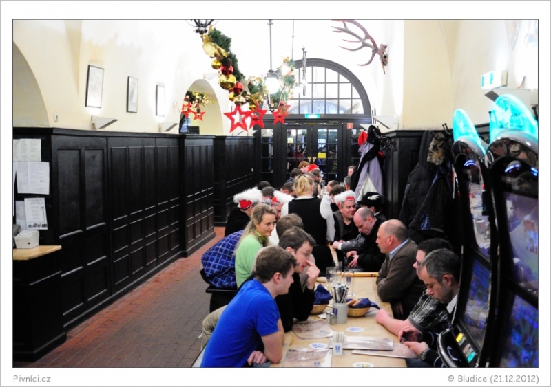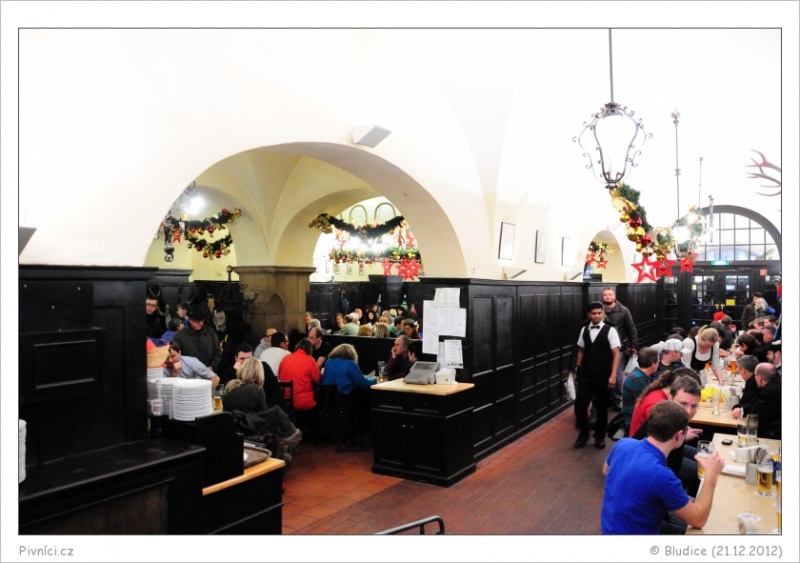 Mnoho navazujících místností a chodeb, některé skromné, jiné hezky zařízené, další nóbl restaurační. Vyzdobené ve starším stylu, opět podobně jako ostatní hospody v tmavém dřevě a s oblouky. Žije to zde, lidé proudí skrz… sedí se tu celkem v pohodě.Obsluha (2,5 - lehce nadprůměr):
