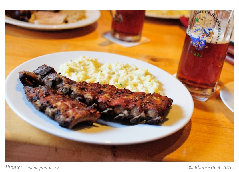 Studené brotzeity i řada teplých jídel – dotsche (bramboráky trochu připomínající lívance), uzeniny, žebra, kolena, řízky. Taková široká nabídka se v zoiglstube moc nevidí. Ceny nízké, dali jsme si žebra s bramborovým salátem, bylo to chutné a syté.Pivo (3 - dobré):