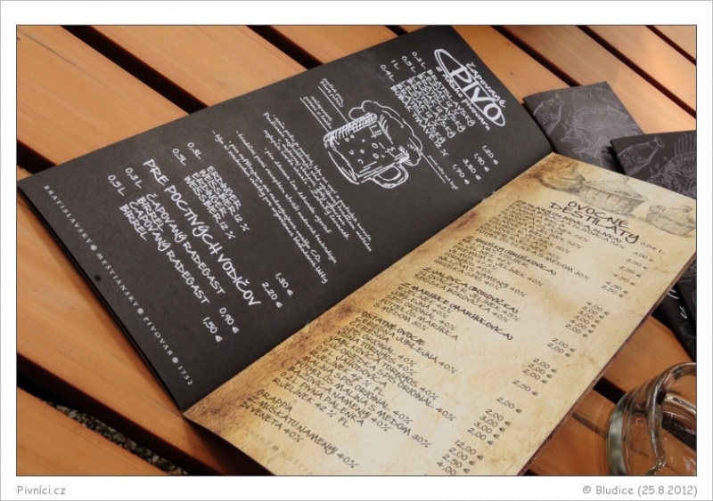 V nabídce dvě piva z vlastního pivovaru, který se nachází v centru města. Piva nejsou nudně tuctová a za sebe mohu říci, že po prvotním překvapení nad jejich chutí, jsem se k nim později ráda vracela. Jen škoda, že Bubáka jsem nedala častěji… nu, snad se zase někdy do Bratislavy podíváme :)Celkový dojem (7 - velmi dobré):
