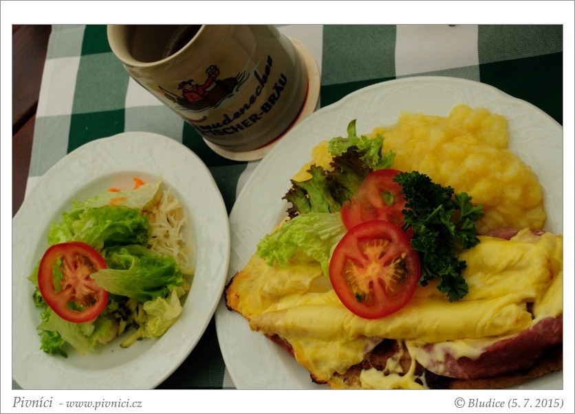 Všemožné klasiky, studená jídla, několik druhů řízků. Ceny průměrné, dali jsme si řízek se šunkou, sýrem, chřestem a bramborovým salátem. Hodně oblohy, svěží, i v parném létě výborné.Pivo (4 - výborné):