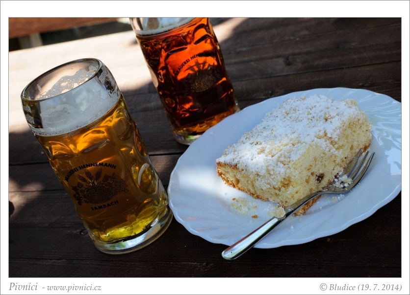 Všemožné smažené záležitosti i nějaké lehčí brotzeity. Ceny lehce nižší. Na oběd pro nás bylo ještě brzy, takže jsme si dali jen na chuť domácí citrónovou buchtu s rozinkami, byla moc fajn.Pivo (3,5 - velmi dobré):