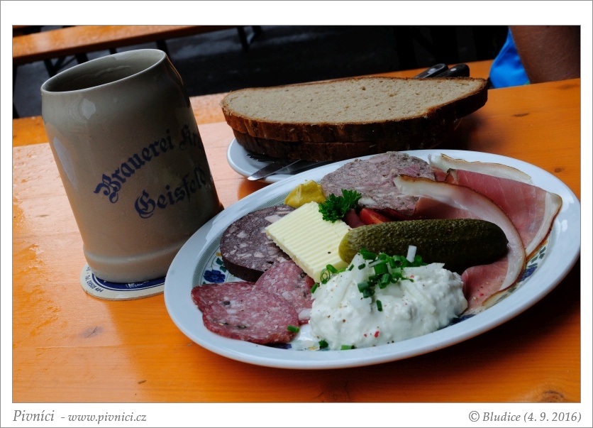 Různé bavorské pochutiny k pivu, ceny spíše levnější. Ochutnáno Zwetschenbames, sušené hovězí maso… pochoutka, opravdu výborné. Při druhé návštěvě jsme si dali míchaný talíř, pět druhů uzenin a čerstvý sýr, vše velmi dobré, zejména tmavá tlačenka byla luxusní.Pivo (4 - výborné):