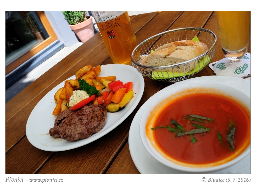 Klasická německá jídla, sem tam i něco zajímavějšího. Ceny průměrné. Přes den meníčka za lehce nižší ceny. Dali jsme si fajn tomatovou polévku a grilované hovězí s bramborami a grilovanou zeleninou. To bylo výborné, šťavnaté, jemné. Jen tu trochu více solí, ale to v Bádensku bývá asi zvykem, dle našich zkušeností.Pivo (2,5 - lehce nadprůměr):