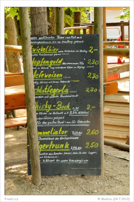 Na čepu bývá kolem deseti druhů piv všech možných stylů, i když ty německé většinou dominují. Dále tu najdete několik druhů piv v láhvi. Nabídka je široká i co se týká síly piva, najdete zde kousky od slabých s 3 % alkoholu po ty silné s alkoholem kolem 10 %. Ceny jsou průměrné, piva dobrá až výborná – doporučujeme zejména silná piva dozrávaná v různých dubových sudech.Celkový dojem (8 - výborné):
