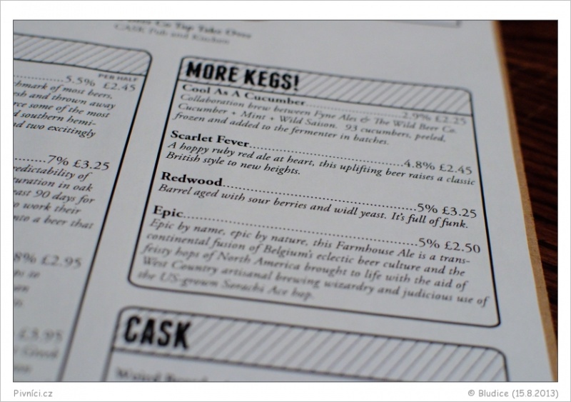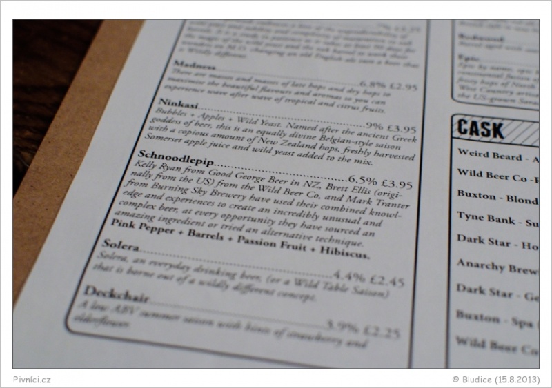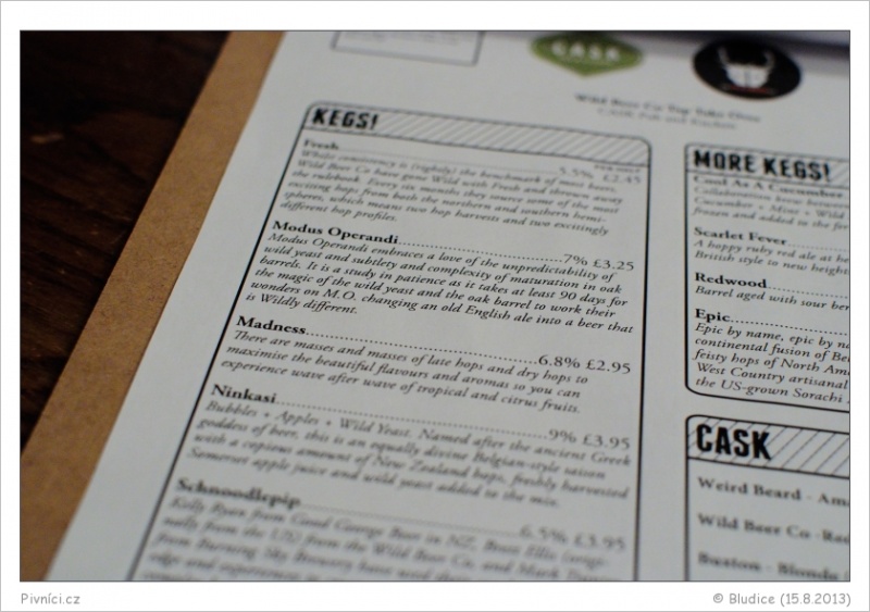 Na čepu 10 piv z casků, dále 15 píp z kegů (cca třetina za nás neobsazených). Výběr piv je luxusní, hodně různých speciálních kousků, za naší návštěvy dost wild / sour ale. Ceny piv z casku jsou spíše nižší, z kegu průměrné.Celkový dojem (8,5 - výborné):