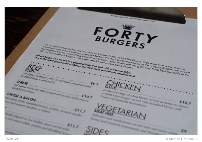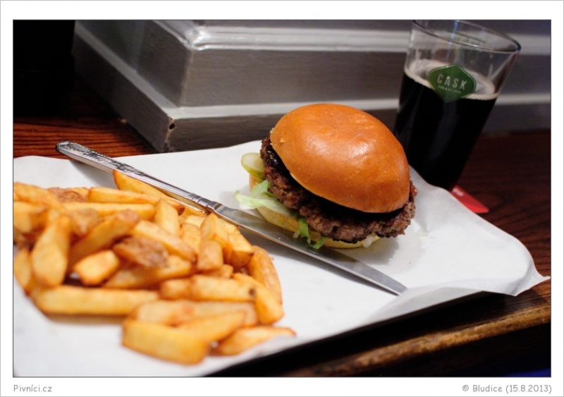 Burgery od přidruženého Forty Burgers. Různé druhy, ceny průměrné. Hranolky bezva, fajn houska i zelenina, ale maso… prostě se dle nařízení úřadů musí dělat medium-well. Maso samotné je fajn, ale prostě to není ono, chybí tomu šťavnatost. Škoda, mohl by to být dokonalý burger.Pivo: