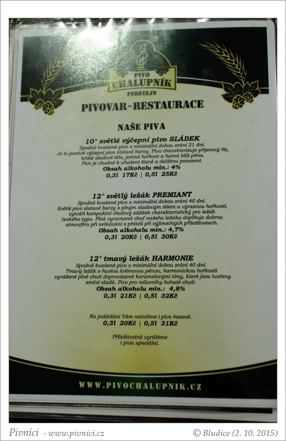 Na čepu pět druhů piva, zřejmě tři z toho ve stálé nabídce – desítka, dvanáctka a tmavé. Dále na čepu polotmavé a Red Ale. Ceny průměrné, některá piva povedená, jiná tolik ne.Celkový dojem (6 - dobré):