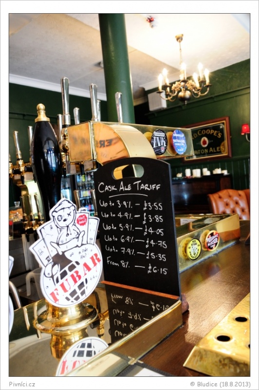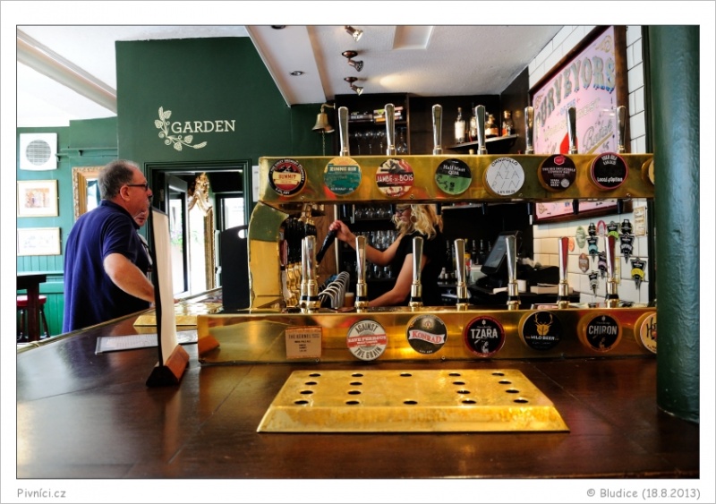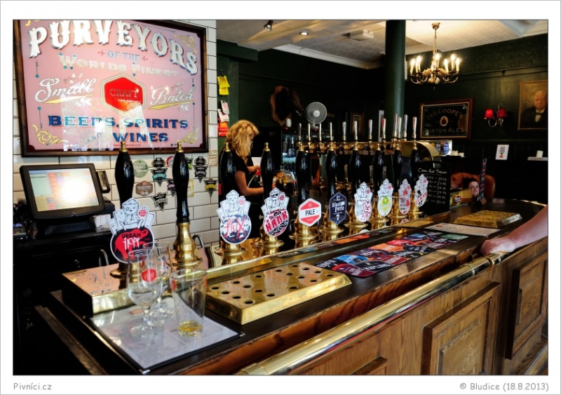 Na čepu 10 piv z casku (malé anglické pivovary) a pokud správně počítám, tak 24 piv z kegu (malé anglické, americké, belgické, italské pivovary, pár ciderů a perry, dokonce i jeden český Konrad), často velmi netradiční a zajímavé kousky. Ceny za cask spíše průměrné, za keg lehce vyšší. Dále je tu skvělý výběr luxusních světových lahvových piv.Celkový dojem (9 - výjimečné):