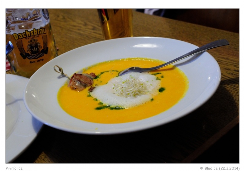 Klasická bavorská jídla a sem tam nějaká netradiční specialita. Ceny průměrné. Ochutnán fajn Leberkäse s bramborovým salátem a výtečná mrkvovo-pomerančová polévka se švestkou a slaninou. Poměr cena / výkon moc příjemný.Pivo (3,5 - velmi dobré):