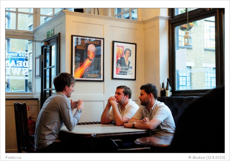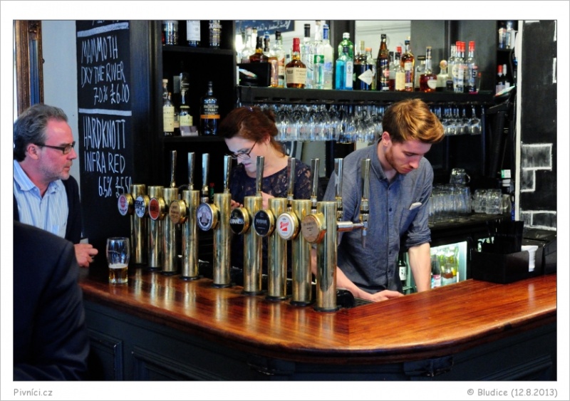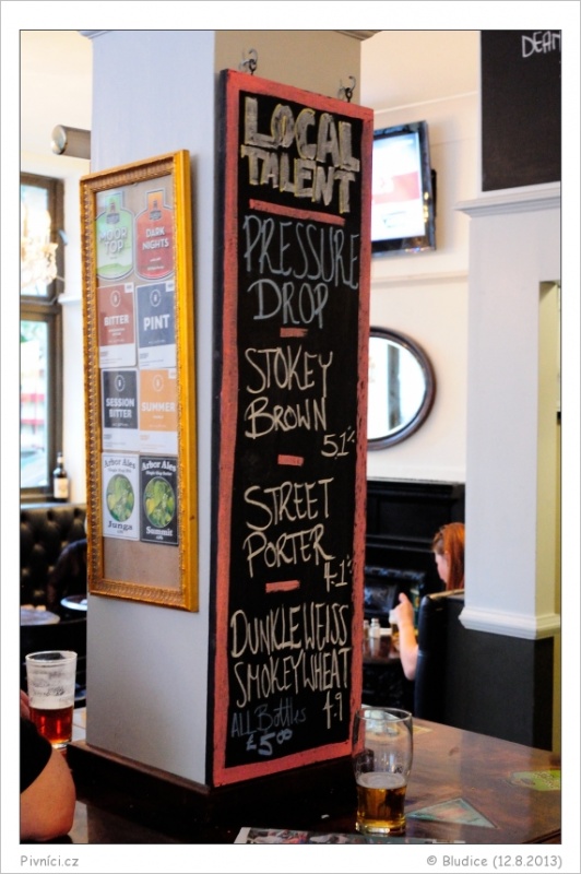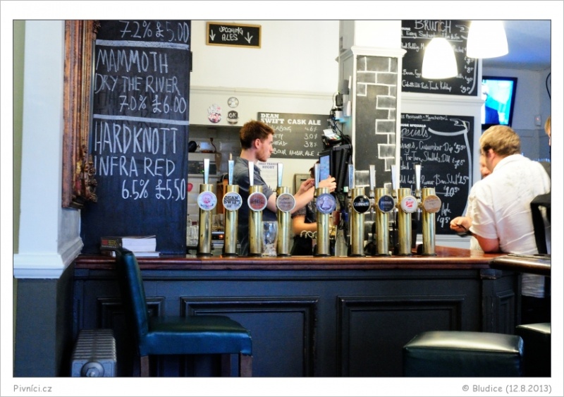 Na čepu 4 piva čepovaná z casků, 8 piv z kegů a 1 cider. Ceny jak u čeho, někdy průměrné, jindy spíše vyšší. Výběr skvělý, zajímavá piva z celé Anglie plus pár průmyslových evropských kousků.Celkový dojem (8,5 - výborné):