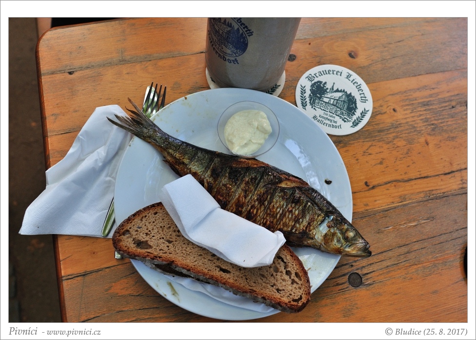 Řada různých jídel, klasické bavorské chuťovky, vuřty, brotzeity a několik velkých jídel – kolena, pečeně, občas i ryby. Ceny nižší. Dali jsme si schäuferlu se zelím a knedlíkem, byla chutná a sytá. Při poslední návštěvě jsme zkusili sledě z grilu, byl také velmi dobrý.Pivo (4,5 - úchvatné):