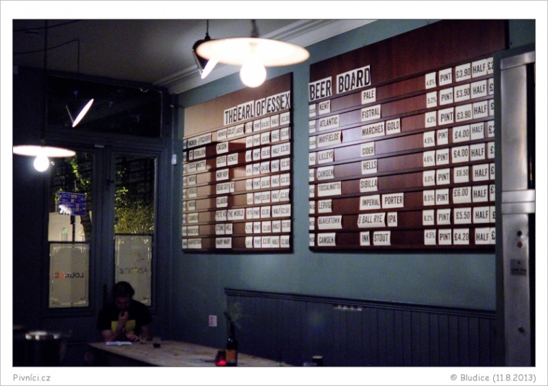Občas zde bývá jedno domácí pivo, my měli bohužel smůlu. Na čepu tedy bylo 5 piv z casku, 11 piv z kegu a 2 cidery. Piva jsou z malých anglických pivovarů a pak je tu řada luxusních kousků z různých koutů světa (za nás Itálie, Norsko, Anglie, Belgie). Ceny jsou průměrné, ty zahraniční ani nejsou nijak výrazně drahé. A dokonce si zde můžete dát i třetinku pinty (u piv s 10%+ alkoholu se to docela hodí).Celkový dojem (8,5 - výborné):