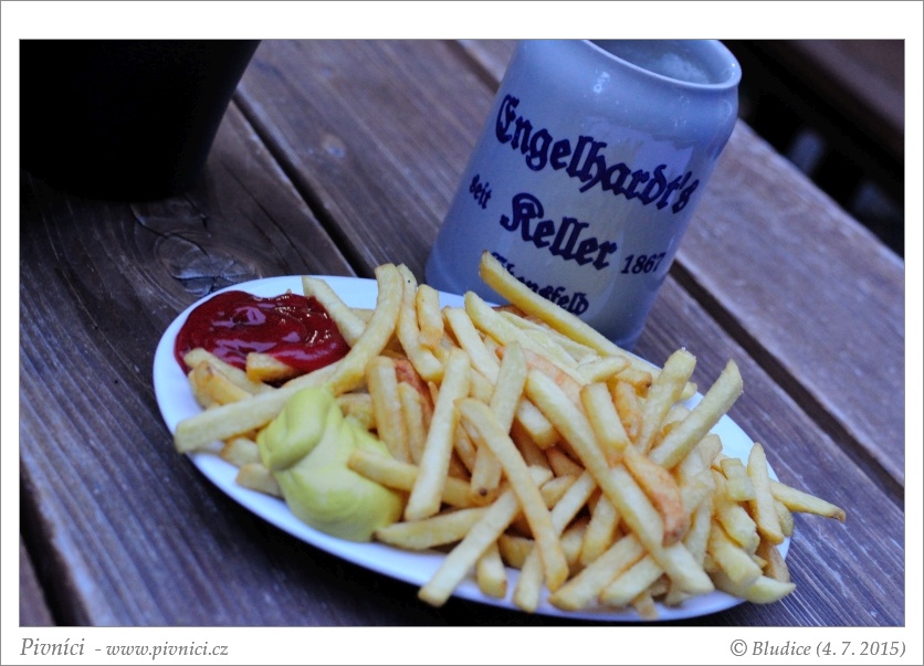 Klasická bavorská jídla, smažené záležitosti, studené pochutiny. Ceny průměrné až lehce vyšší. Dali jsme si jen hranolky, byly fajn.Pivo (4 - výborné):