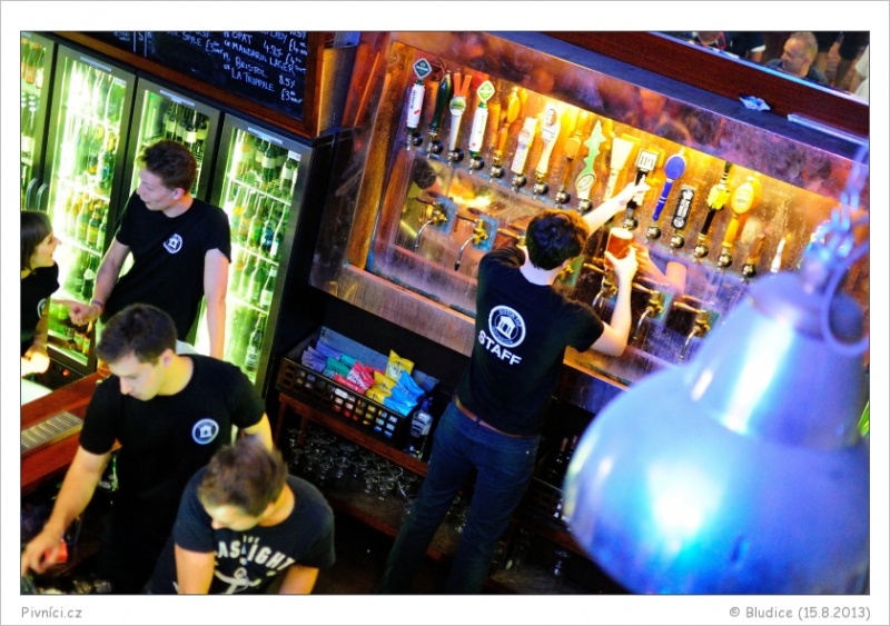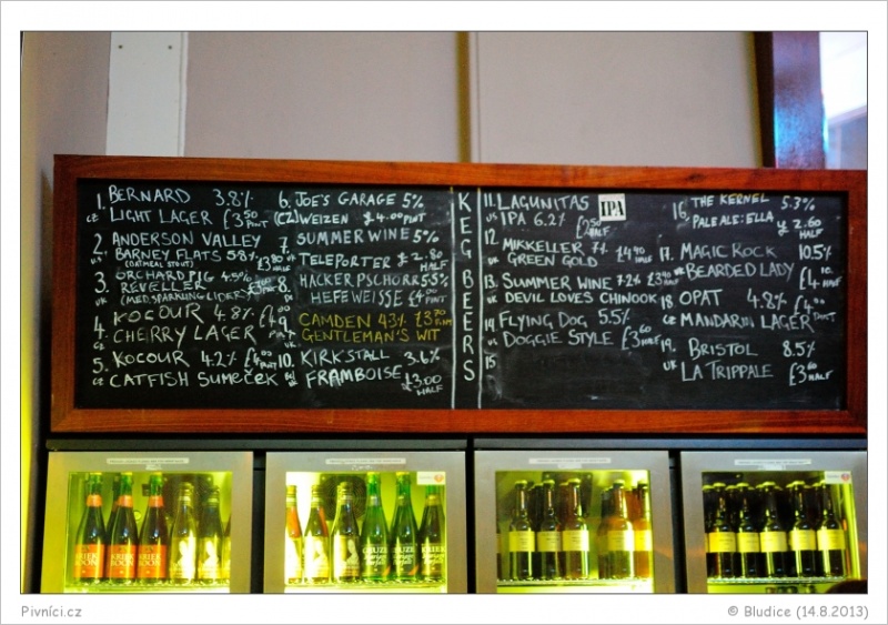 Na čepu piva z osmi casků (menší anglické pivovary), 19 kegů (Anglie a zajímavá piva z celého světa, za naší návštěvy i Matuška, Kocour, Opat, Budvar a Joe's Garage). Piva povětšinou super. Ceny piv z casku nižší, ty z kegu spíše průměrné.Celkový dojem (8,5 - výborné):