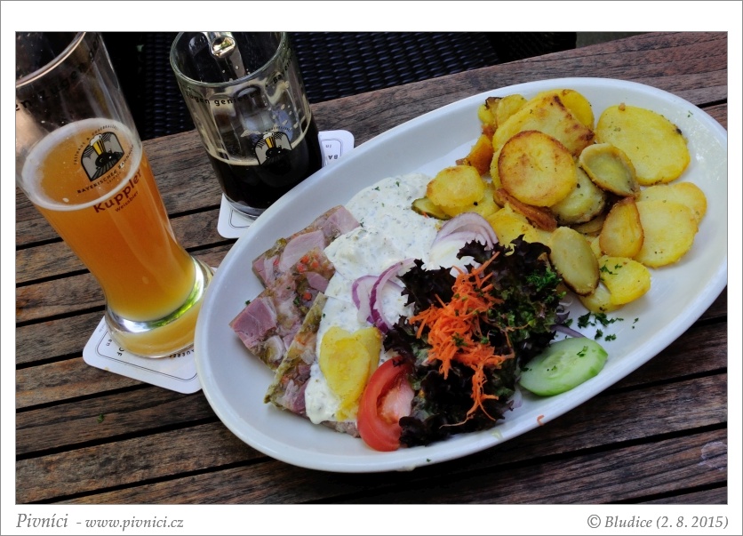 Slušná nabídka, vesměs klasická německá jídla. Ceny průměrné. Dali jme si tlačenku z kolene s remuládou, okurkami, cibulí a pečenými bramborami. Bylo to velmi chutné a syté.Pivo (3,5 - velmi dobré):