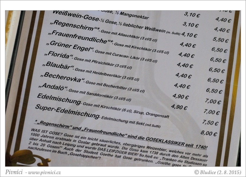 Na čepu tři domácí piva, cena lehce vyšší, piva vesměs pitelná, ale žádný zázrak. Krom toho čepují i moc fajn Bayrisher Bahnhof Gose a Ritterguts Gose, též i pils Ur-Krostitzer.Celkový dojem (7,5 - velmi dobré):