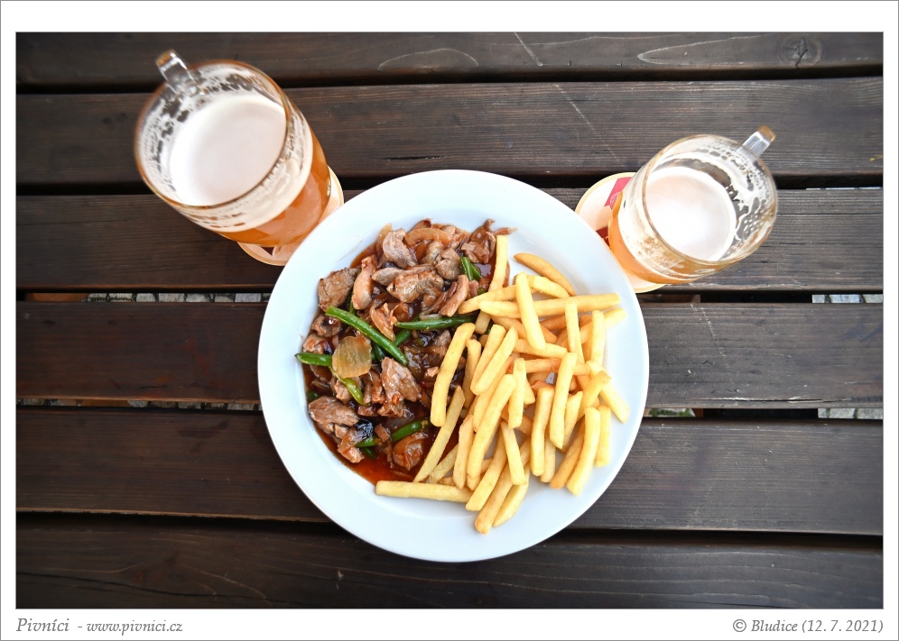 Vesměs klasická česká jídla, občas v modernějších obměnách. Ceny průměrné. Pikantní nudličky z fazolkami a hranolky byly dobré.Pivo (2,5 - lehce nadprůměr):