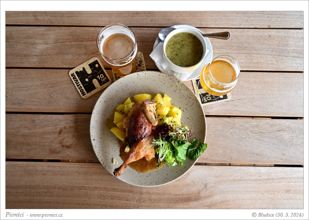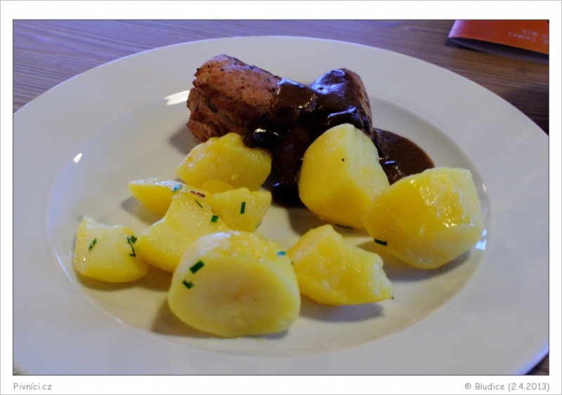 Slušný výběr klasických jídel za průměrné ceny, plus přes týden zvýhodněné denní menu. Ochutnali jsme krásně šťavnatou vepřovou panenku a příjemně kořeněný (byť krapet sušší) králičí hřbet. Při další návštěvě jsme zkusili chutnou směs z vepřové panenky a zeleniny s bramboráky a jemného výborného španělského ptáčka s rýží. Při poslední pak fajn krém s medvědím česnekem a půl bezva ochuceného kuřete s jarní nádivkou, pažitkovými bramborami a salátem. Ve výsledku rozhodně spokojenost. Přes léto jsou na zahrádce k dispozici poctivé klobásy, jsou velmi chutné.Pivo (3,5 - velmi dobré):