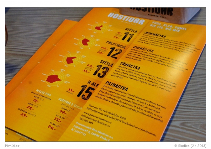 Čtyři stálá piva a k nim většinou jeden střídající se speciál (občas dva nebo žádný). Ceny jsou průměrné. Piva bývají chutná a slušně pitelná, ale v poslední době jsou některá i docela nedobrá.Celkový dojem (7 - velmi dobré):