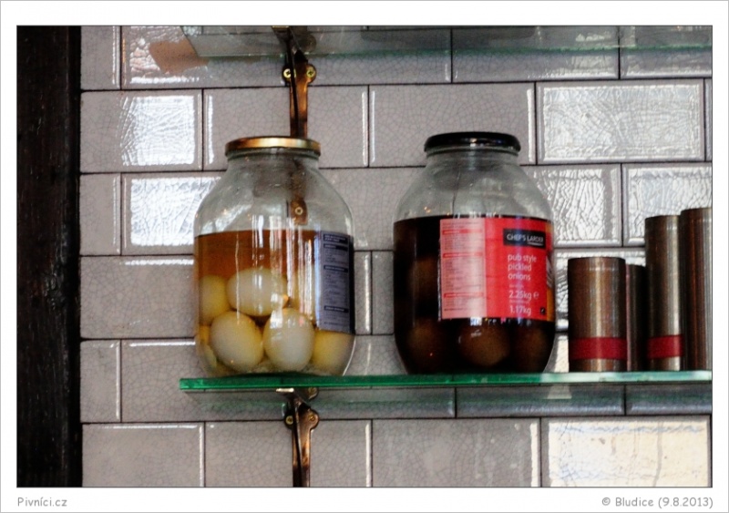 Různé pochutiny k pivu, ochutnali jsme jen nakládanou cibuli a vejce… obojí super, ale cibule je tak výrazná a kyselá, že z každého piva se pak stane nezajímavá voda :o)Pivo (4,5 - úchvatné):