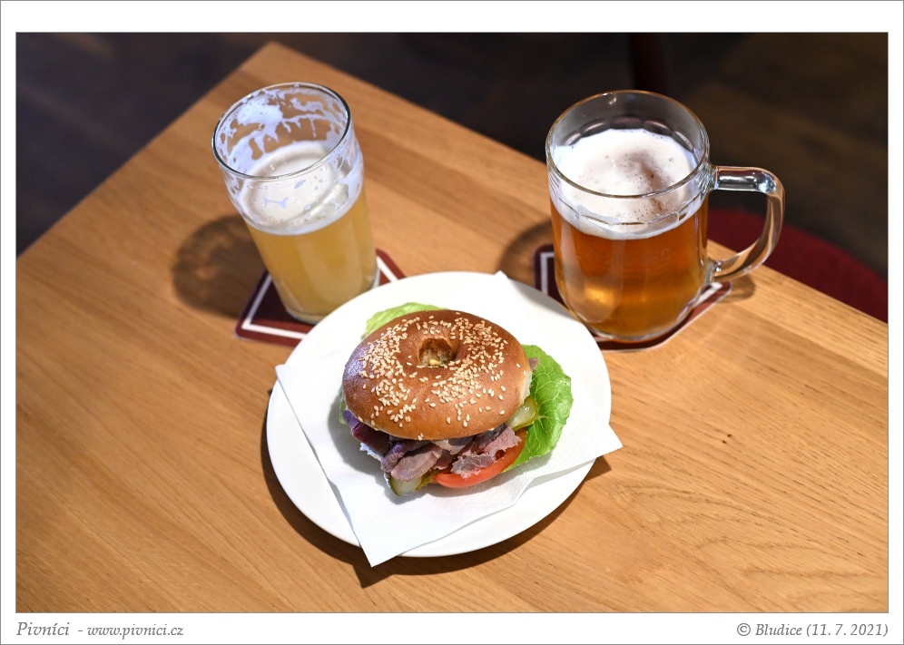 Různá menší a větší jídla burgery, steaky, bagely. Ceny průměrné. Dali jsme si bagel s rostbífem, byl velmi chutný.Pivo (4 - výborné):