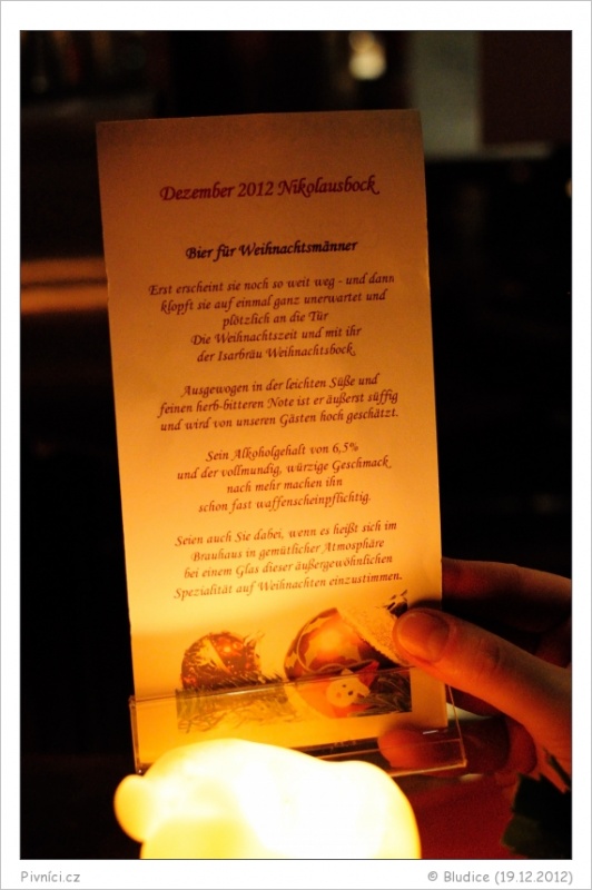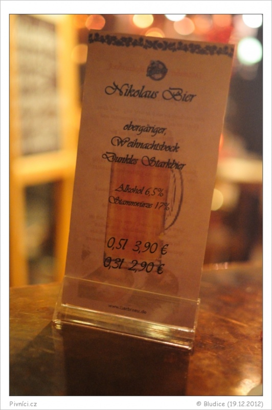 Jedno dobré vlastní stálé pivo (Zwickel) a v době naší návštěvy úžasný sváteční Weizenbock. Druhé pivo ale asi není pravidlem. Ceny takové průměrné mnichovské.Celkový dojem (7 - velmi dobré):